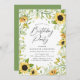 Elegante, blumengeschmückte Geburtstagsfeier mit Party-Details inmitten von Aquarellsonnenblumen und üppigem Grün. Die Geburtstagsparty der Sonnenblume lädt zu einem soliden grünen Hintergrund zurück.