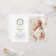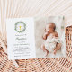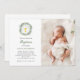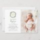 Diese einfache und minimalistische Taufe oder Weihnachtseinladung besticht durch einen eleganten Aquarellkranz voller rustikaler Vegetation und Blätter, mit einer Darstellung eines Kaims und einer subtilen grünen Aquarellfärbung in der Mitte auf weißem Hintergrund. Das Foto Ihres Babys wird ebenfalls vorgestellt.