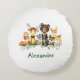 Watercolor Woodland Tiere Rundkissen. Zu den Kleinkindern zählen Bären, Hirsche, Elche, Raccoon, Kaninchen, Fox und Eukalyptus-Blätter und Waldpflanzen. Name hinzufügen.