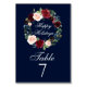 Gute Ferien. Eleganter blauer Hintergrund mit Watercolor Burgundy Marsala Floral Wreath Holiday Party Tischnummer. Freuen Sie sich auf schöne Rose und botanische Vegetation.