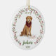 Niedliche und bezaubernde Woofy Weihnachten Aquarellfarbe golden Retriever Hundeverzierung mit unserem handgemalten Aquarell schelmisch geiler goldener Retriever Hund mit einem Keks im Mund. Der goldene Retriever hat den ganzen Teller Kekse für den Weihnachtsmann gegessen. Ein Kranberry-Blattwerk in Aquarellfarbe umrahmt das Ornament mit personalisiertem Haustiernamen, Jahr und Monogramm. Auf der Rückseite befindet sich ein Platzhalter für das Foto, um das spezielle Foto Ihres Haustieres anzuzeigen. Dieses Weihnachtsfest Golden Retriever Hundeschmuck ist perfekt für Tierliebhaber. Alle Illustrationen sind handgezeichnet Originalwerke von Moodthology.