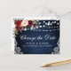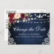 Moderne elegante Watercolor Burgund Floral Change The Date Wedding Postponement Postcard mit bordeauxroten Rose, rosa Rosen und grünem Grün auf rustikalem blauen Holz mit Saitenleuchten und Spitzen.
