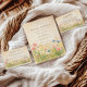 Ein dezentes Wasserfarben-Wiesendesign mit zarten Gänseblümchen, rosa Kosmos, blauen Kornblumen und fröhlichen gelben Blüten, die in einer frischen Frühlingsanordnung zusammengestellt sind. Die Blumen erheben sich natürlich vom unteren Rand des Layouts und schaffen eine luftige, offene Komposition mit einem warmen Pergamenthintergrund. Leicht, romantisch und mühelos elegant, fängt dieses Design den Charme eines sonnendurchfluteten Landgartens ein. Perfekt für eine Braut, die naturinspirierte Details mit einer zeitlosen, eleganten Note liebt.