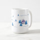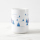 Eine Kaffee-Tasse mit schneebedeckter Landschaft in Aquarellmalerei mit Tannenbäumen und einem lila Haus. Es könnte ein großartiges Geschenk für Weihnachten sein!