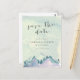 Eine moderne Hochzeit erspart Ihnen die Postkarte für Ihre Hochzeit auf der Bergseite. Dieses Design zeichnet sich durch "Save the Date" in Holzkohle modernen kalligrafischen Schriftart, mit Aquarellgebirge und Bäume in blau und lila auf einem Aquarellspülhintergrund.