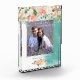 Aquarellfarbener geometrischer rot-rosa Blumenblock mit blühendem Foto. Dieses wunderschöne Hochzeitsgebäude aus Foto mit geometrischen Aquarellfarben und rosa Blumenarrangements auf blauem Aquarellhintergrund.