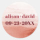 Dieser elegante japandi Hochzeitsrundaufkleber zeigt einen faszinierenden Farbverlauf in der Wasserfarbe. Das Design ist schlicht und minimalistisch, mit einer horizontalen Linie, die die Namen der Paare und das Datum ihres besonderen Tages anmutig trennt. Der atemberaubende Hintergrund ist mit einer harmonischen Mischung aus Terrakotta und Brauntönen geschmückt und schafft eine warme und einladende Atmosphäre.