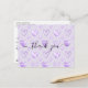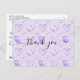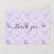 Erstellen Sie Ihre eigene elegante Kalligraphie mit Signatur-Stil-Swashes danke Postkarten für Ihre Babydusche. Sie können den schwarzen Schriftart und den weißen Schlagschatten des extravaganten Skripts anpassen. Das Muster wird auf einem pastellfarbenen, lila, soliden Hintergrund dargestellt. Das Muster zeigt die Wasserfarbenherzen.
