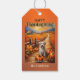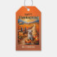 Ein Geschenktag mit einem bunten Gemälde eines niedlichen Hundes in einer landschaftlichen Herbstlandschaft mit Kürbissen. Dieses Design eignet sich perfekt für Erntedank- oder Herbstfeiern.