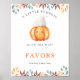 "Ein kleiner Kürbis ist unterwegs. Feiern Sie mit diesem Baby Cartoon Kürbis Thema für Baby Dusche Party! Wasserfarbener niedlicher Cartoon Kawaii Kürbis mit Herbstmütze (Kappe) und Herbstlauben. Auf der Rückseite der Karte befinden sich Herbstblätter.