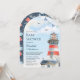 Erleben Sie Ihren Aufenthalt mit dieser eleganten Babydusche und einem schönen roten und blauen Leuchtturm mit moderner Typografie. Fügen Sie einfach Ihre Veranstaltungsdetails zu dieser einfach zu bedienenden Vorlage hinzu, um sie zu einer einmaligen Einladung zu machen.
