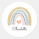 Niedliche personalisierte Kinder-Aquarell Boho Regenbogenaufkleber, mit einem rosa Senf und blauem Regenbogen mit rosa Herz in der Mitte und Name.