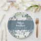 Romantische Hochzeitsblumenpapier-Teller mit einem zarten Aquarellbukett mit sanften, weißen Blume, Grünpflanzen und anderen botanischen Blättern auf einem schiefergrauen Hintergrund. Bearbeiten Sie die Vorlagenfelder einfach, um Ihre Namen und das Hochzeitdatum in einem klassischen weißen Schriftart hinzuzufügen. Sehen Sie sich die passende Kollektion "Weiße sanfte Blume - Romantische Gray Wedding Suite" an, um alle koordinierenden Objekte, wie Papierservietten, Untersetzer, Einladungen, RSVP-Karten und vieles mehr, zu sehen. Für weitere Personalisierungen oder Sonderanfertigungen, kontaktieren Sie mich bitte unter acherryonthecake@hotmail.com (bitte 1-2 Arbeitstage).