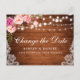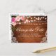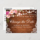 Moderne Elegante Wasserfarbe Rosa Blütenblüte Veränderung Das Datum Hochzeit Postponement Postcard bietet rosa Rosen und Grün auf rustikalem Holz mit Saitenleuchten und Spitzen.