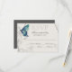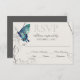 Diese geometrische, blumengeschmückte RSVP-Karte verfügt über einen dramatischen blauen Schmetterling. Es liegt auf einer eleganten Blume, die wunderschön mit einem dunkelgrauen Hexagon auf einem staubigen beigen Hintergrund verwoben ist.