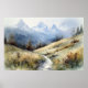 Aquarellmalerei eines Weges, der sich durch sanfte Wiesen in den Vorgebirgen unter einem schneebedeckten Felsengebirge zieht. Das ist ein weiteres 100% originelles Schnürhammer Design.