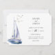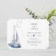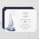 Wasserfarbene Yacht, Wassersport Thema Hochzeit Einladung. Koordinieren der dunkelblaue Farbunterlage der Marine. Die Einladung beinhaltet eine schicke Typografie Design Stil Mischung aus Kalligrafie und fett-Typ.