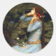 John William Waterhouse Ophelia Aufkleber. Ölmalerei auf Leinwand aus dem Jahr 1894. Der englische Künstler John Waterhouse zeichnete häufig über literarische Themen und Shakespeare war eine seiner beststen Inspirationsquellen. Das Wasserhaus widmete mehrere Gemälde dem zum Scheitern verdammten Helden Ophelia von Hamlet. Dieses frühe Gemälde zeigt das Mädchen mit einem hellblauen Kleid mit Goldstickerei und juwelenbesetzten Armbändern. Ophelias Haar ist feucht und mit dunkelroten Blume geschmückt. Sie sitzt am Rande eines Teiches voller Seerosen mit Gänseblümchen in ihrem Schoß. Ein großartiges Geschenk für Fans von J.W. Waterhouse, Shakespeare, Ophelia, den Pre-Raphaelites und der englischen Romantik.