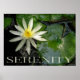 Eine ruhige, weiße Wasserlilie, offen für volle Blüte, Erholungen Ruhe in einem ruhigen Teich von üppigen grünen Lilienpfählen. Unter der Blüte steht das Wort "Serenity", das in einer blasscremefarbenen Serifenschrift geschrieben ist. Das ruhige und entspannende Bild wäre eine perfekte Ergänzung zu jedem Zuhause, Yogastudio oder meditativen Raum. Foto © Cheryl M. Barber.