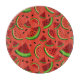 Lebhaftes und farbenprächtiges Muster mit verschiedenen Wassermelonen-Scheiben, dreieckig und halbmondförmig, Set vor einem hellroten Hintergrund. Kleine schwarze Samen sind im gesamten Design verstreut, was das fruchtige Thema verstärkt.