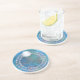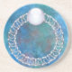 Ein verzierter, stilisierter silberner filigraner Ring mit bewölkten Perlen und Set mit einem Single runden weißen Edelstein mit einem Stern Blick aus seinen Tiefen, Set vor einem Hintergrund von wasserblauen Fraktalen.