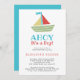 Retro Stil bunt nautische Segelschiff Thema "Ahoy it's a Boy" Baby Dusche Einladung in pulsierend aquamarin blau und rot.