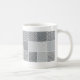 Quadratische Platten der gelegten Punktraster von Schwarzem und von Grau schaffen Wässerungsmuster, die diese Tasse umkreisen.