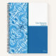 The artist's pattern design of water and waves is on the side of the notebook, front and back. On the other is a white and blue square with a blue line in the middle. And the texts can be personalized by the customer.