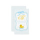 Baby blue gingham baby shower with a hand drawn bow. Water droplets frame a rubber duck surrounded by bubbles