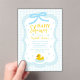 Baby blue gingham baby shower with a hand drawn bow. Water droplets frame a rubber duck surrounded by bubbles