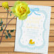 Baby blue gingham baby shower with a hand drawn bow. Water droplets frame a rubber duck surrounded by bubbles