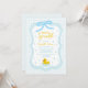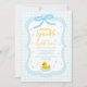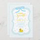 Baby blue gingham baby shower with a hand drawn bow. Water droplets frame a rubber duck surrounded by bubbles