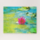 Eine Fuchsienwasserlilie mit kalk-grünem Blattwerk im türkisfarbenen Wasser macht ein von Monet inspiriert Puzzle.