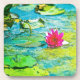 Eine fuchsienartige Wasserlilie mit kalk-grünem Blattwerk im türkisfarbenen Wasser.