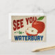 Eine charmante Waterbury Connecticut Vintage Reise-Postkarte mit einem schönen roten Apfel, zusammen mit lustigen Retro-Text, der sagt: "See you in Waterbury"