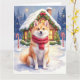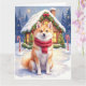 This festive Christmas card features a majestic Akita proudly sitting beside a charming gingerbread house, complete with glowing holiday lights and candy cane accents. Painted in a warm watercolor style, this cozy winter scene captures the spirit of the season and makes a delightful choice for dog lovers. With a blank interior perfect for personal messages, it’s ideal for holiday greetings, gifting, or collecting breed-themed stationery.