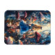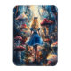 A whimsical watercolor design featuring Alice walking along a woodland path lined with red cap mushrooms, capturing the magical charm of Wonderland.