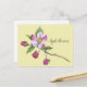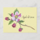 Pretty postcard design feys watercolor botanical style style style illustration of pink apple blossoms on branch with script style machen on pastel yellow background.