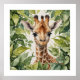 Schöne, detaillierte und realistische Abbildung einer jungen Giraffe, umgeben von üppig grünen Blätter. Die ausdrucksvollen Augen und die aufwändigen Details verleihen der Giraffe ein lebendiges Aussehen, das das Kunstwerk faszinierend und einnehmend macht.