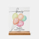 Mehrfarbige Aquarellballons sind ein lustiges Design für eine Babydusche, Ihre Details und das Wort "Favors" sind oben auf diesem klaren Acryl-Schild dargestellt. ÄNDERN SIE DIE GRÖSSE, um Ihre Veranstaltung und Bestellung mit oder ohne Holzständer. PASSENDE Artikel in unserer Sammlung.