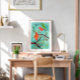 Aquarell Birds Wall Art, un krankño con un acabado estilo acuarela de pareja de pajaros en color rojo, con fondo en tonalidades verdes y azules, un poster para decorar esos espacios speciales de tu hogar, con colores alegres para hacer resaltar esa pared de tu hogar.