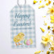 Destei's watercolor baby chick and pastel eggs. The background features a blue gingham pattern with two personalizable text areas. One reads “Happy Easter!” while the other is ideal for adding who the gift is from.