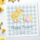 Destei's watercolor baby chick and pastel eggs on a blue gingham pattern. The design also includes two personalizable text areas: one reads ‘Happy Easter!’ while the other can be personalized with an event name, theme and year. Perfect for spring and Easter celebrations and gatherings.