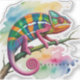 A vibrant watercolor illustration of a panther chameleon perched on a green branch against a white background. The chameleon's body features a striking pattern of alternating stripes in turquoise, orange, green, and white colors. The creature has a distinctive curved tail, bright pink legs, and a detailed mosaic-like pattern on its face with a red eye. The chameleon's mouth is slightly open, revealing small teeth. The background consists of colorful watercolor splashes and washes in blue, yellow, pink, and green hues. The branch the chameleon rests on is rendered in dark green with small leaves visible. The illustration has a loose, artistic quality with visible brush strokes and watercolor texture throughout. The chameleon is positioned diagonally across the composition, facing right, with its body taking up the central portion of the image.