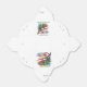 A vibrant watercolor illustration of a panther chameleon perched on a green branch against a white background. The chameleon's body features a striking pattern of alternating stripes in turquoise, orange, green, and white colors. The creature has a distinctive curved tail, bright pink legs, and a detailed mosaic-like pattern on its face with a red eye. The chameleon's mouth is slightly open, revealing small teeth. The background consists of colorful watercolor splashes and washes in blue, yellow, pink, and green hues. The branch the chameleon rests on is rendered in dark green with small leaves visible. The illustration has a loose, artistic quality with visible brush strokes and watercolor texture throughout. The chameleon is positioned diagonally across the composition, facing right, with its body taking up the central portion of the image.