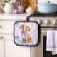 Celebrate the irresistible charm of the beloved dachshund with this delightful doxie-themed oven pot holder. This sweet wiener dog portrait features a long-and-low doxie sitting proudly with a soft, curious expression and soulful eyes that instantly melt hearts. Around the adorable sausage dog, playful watercolor florals bloom in soothing purples and blues, creating a light, airy garden setting.