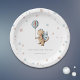 Niedliche Aquarellfarben Erstgeburtstag Party Papier Teller mit einem Drachen mit einem blauen Ballon, wo die Zahl 1 in einer koordinierten braunen Farbe. Die Nummer kann auch personalisiert werden. Illustriert und entworfen von Patricia Alvarez.