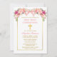 Elegant Watercolor Pink Floral First Holy Communion Invitation includes pink roses and greenery. Gold Cross. Pink Blush Bow Ribbon. Gold Frame.