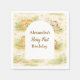 A soft and charming safari-themed design featuring gentle watercolor animals surrounded by delicate wildflowers and botanical greenery. Sweet lions, giraffes, elephants, and zebras create a whimsical storybook scene in warm neutral tones of beige, cream, and soft sage. The elegant arch layout and botanical details give this design a timeless and refined look, perfect for celebrating a little one’s special first birthday.
