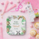 Serve up party treats in style with these adorable watercolor safari animal paper plates. Featuring a vibrant jungle frame with hand-painted animals, including a lion, tiger, panda, giraffe, elephant, and a cute sloth. The central white square elegantly displays the birthday message and name, making it a perfect focal point for your table decor. Ideal for a boy's 1st birthday, "Wild One" themed party, or a tropical baby shower. Sturdy, high-quality, and fully customizable to suit your celebration!